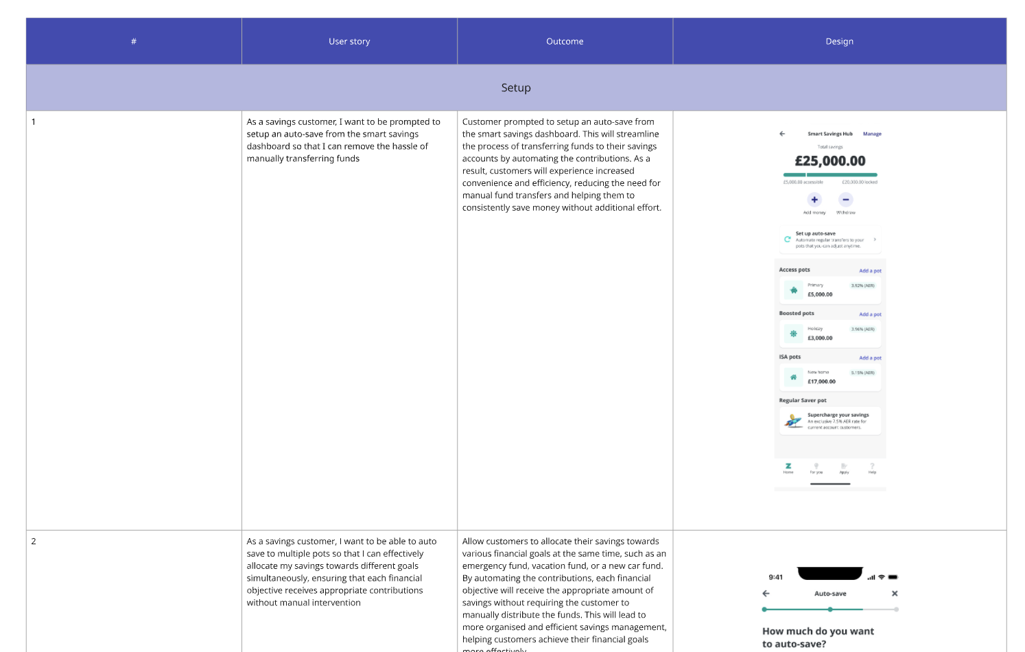 Once we had validated the designs through usability testing and aligned on the hybrid Auto-Save model for MVP, the next step was to prepare a structured development handover. Given the complexity of allowing customers to auto-save across multiple pots, I worked closely with our engineers and product team to ensure that requirements were clear, testable, and prioritised effectively.To support the build, I created a detailed set of user stories that captured:
